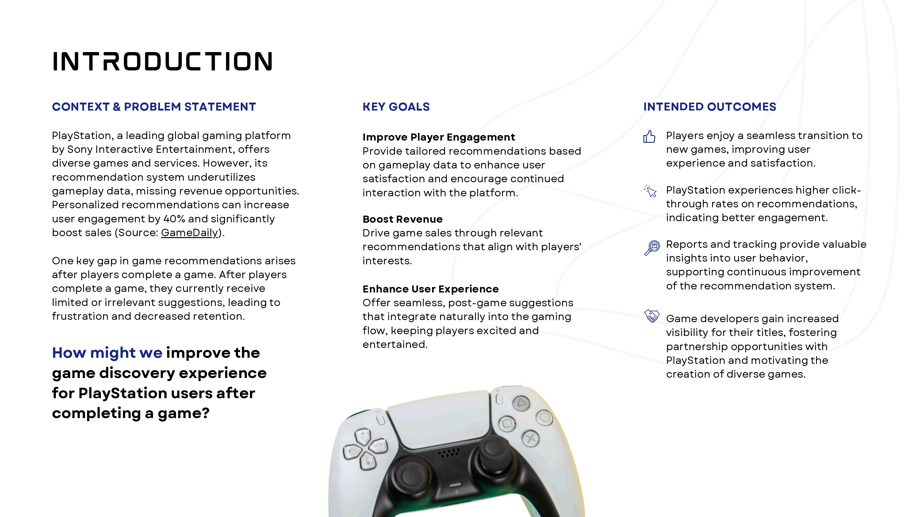 Sony Interactive Entertainment’s PlayStation platform is one of the most popular gaming ecosystems globally, offering thousands of titles—but falling short when it comes to leveraging gameplay data for personalized recommendations. After completing a game, players currently see limited or irrelevant suggestions, which disrupts the user journey and affects both engagement and revenue potential.