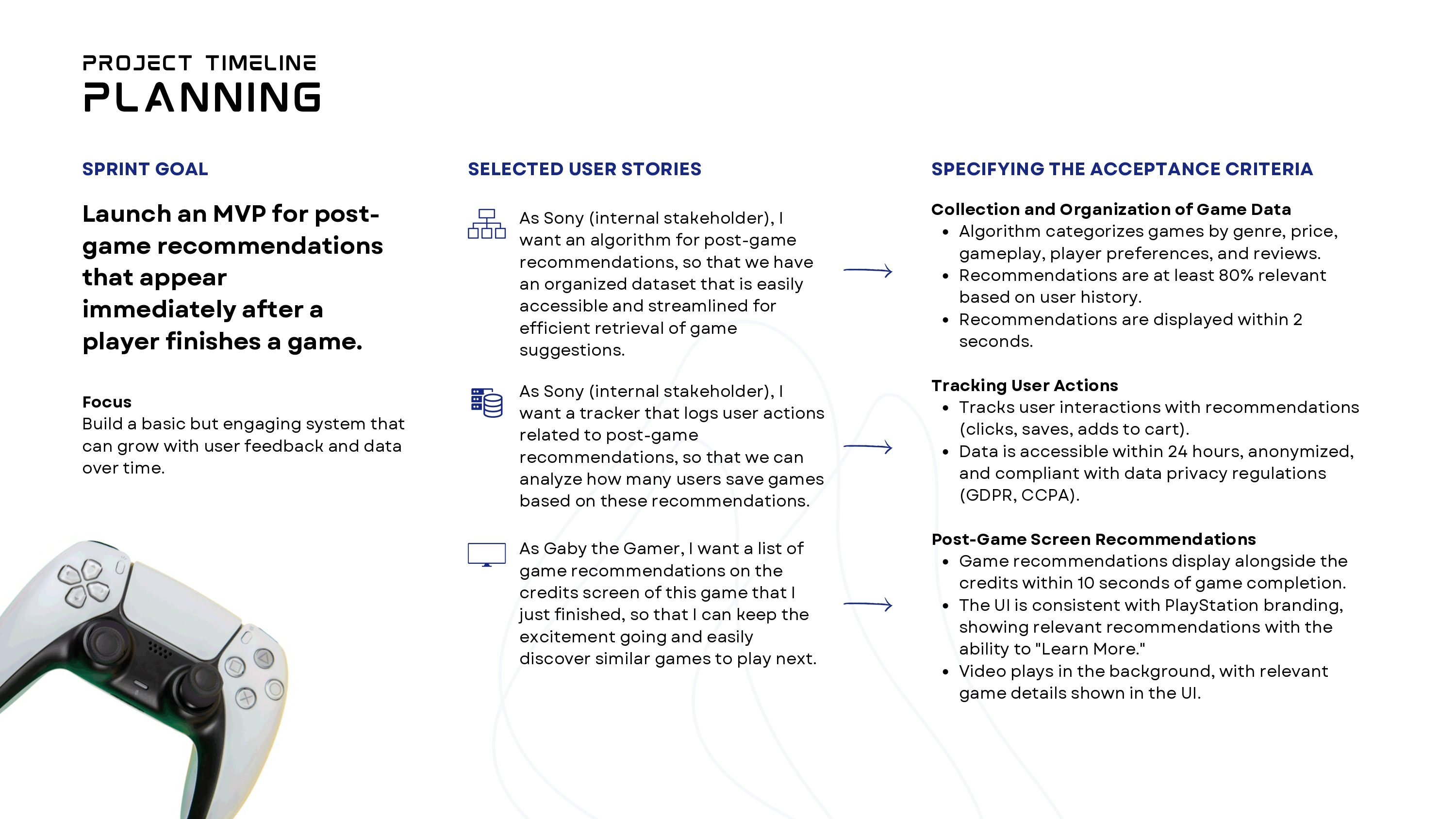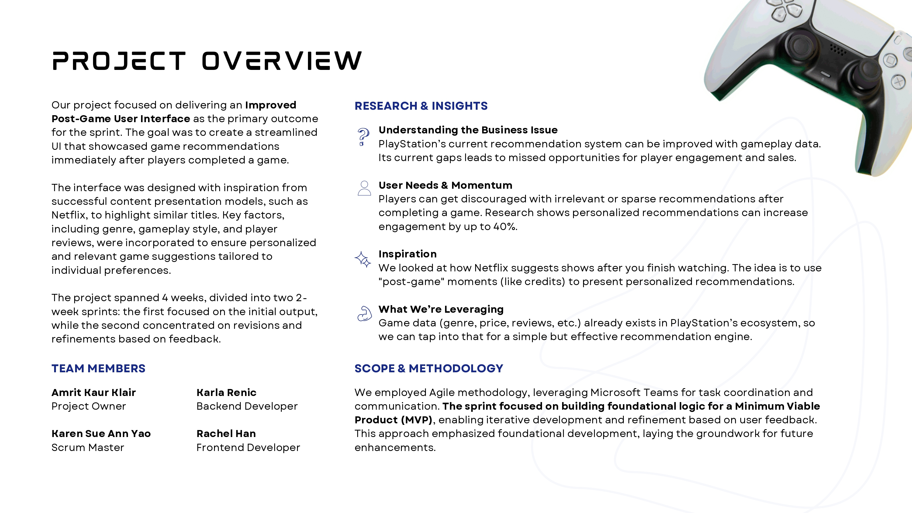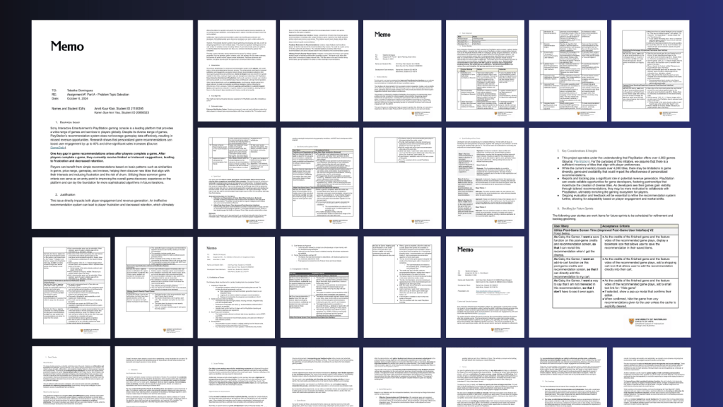 Our team successfully delivered a functional MVP of a post-game recommendation feature for PlayStation. Over two sprints, we collaborated with a paired development team, acting as product managers and Scrum leaders. We defined the problem, created a product backlog, and scoped user stories aligned with business value.