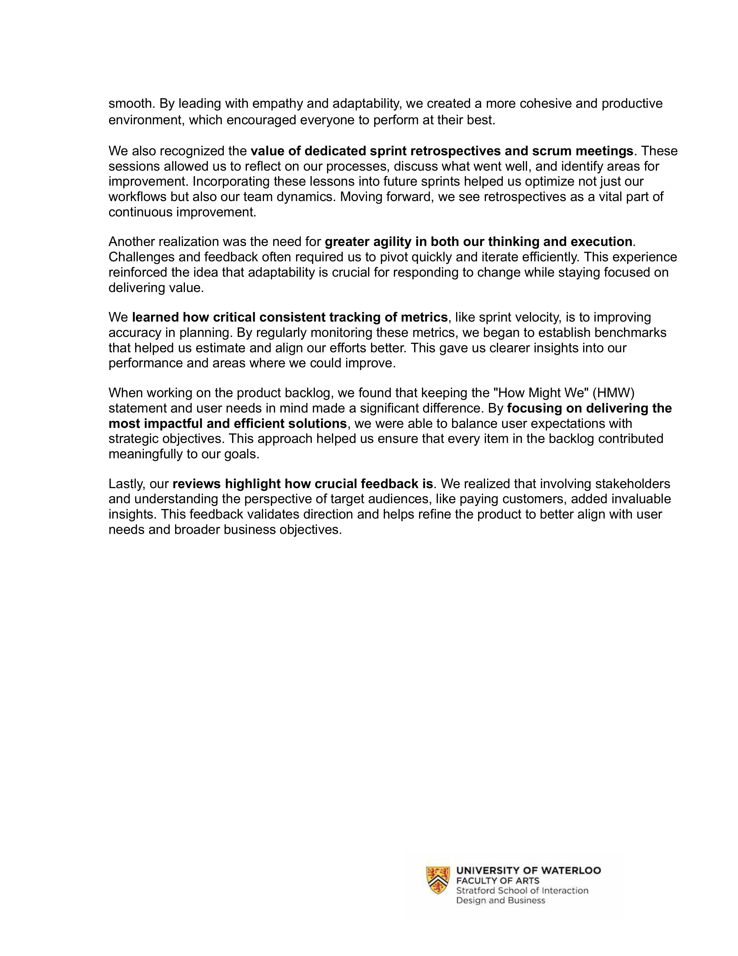 This was a product management project where we worked as a product team, paired with a group of developers from the same program who were responsible for building our feature. I served as the Scrum Master, and our work spanned ideation, scope definition, and sprint execution.