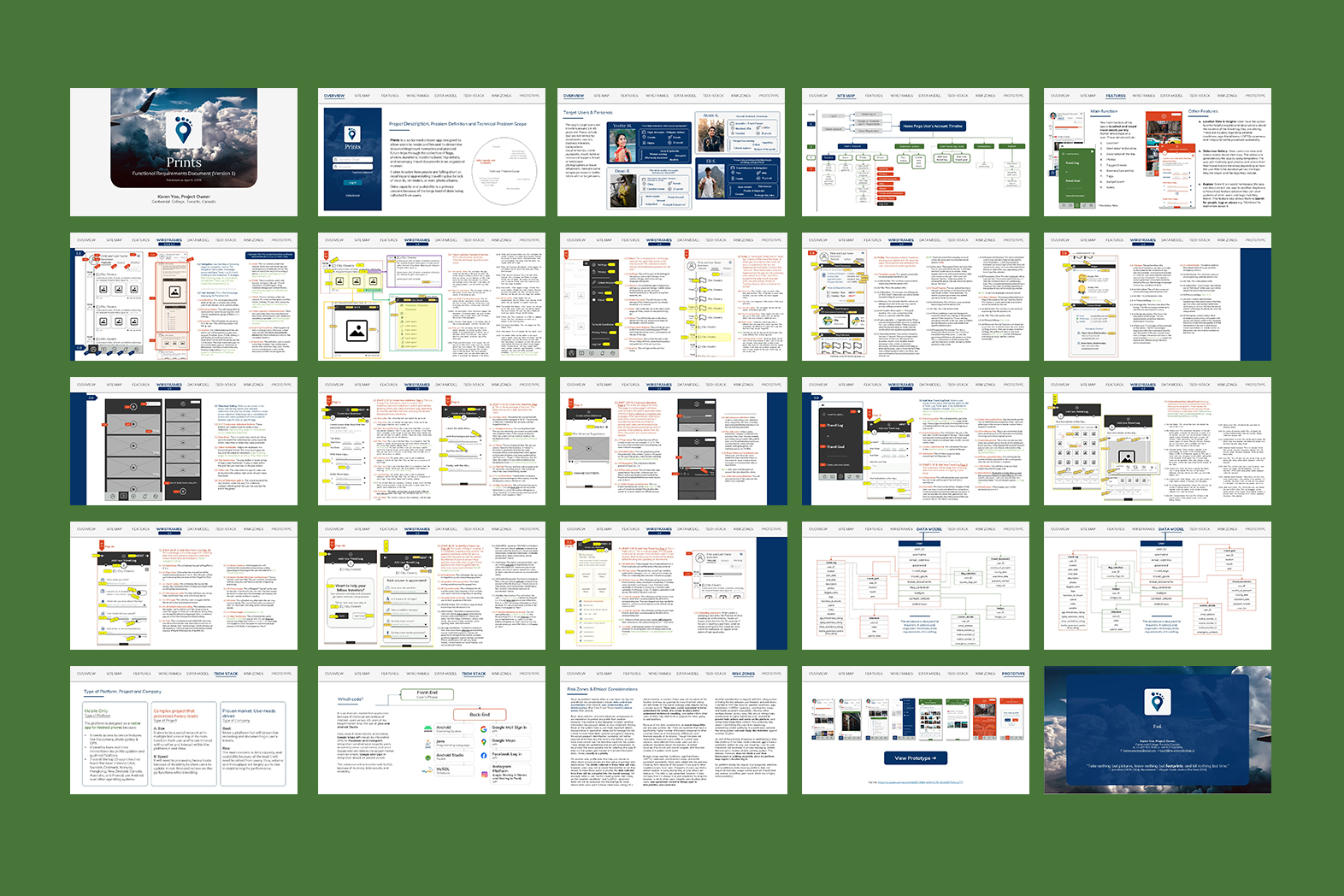 Prints is a social media travel app designed to create profiles for any type of traveler and to streamline documenting travel memories and planned trips through the collection of flags, photos, dates, locations, basic trip details, and necessary travel documents in an organized manner. It aims to solve how people are falling short on recalling and appreciating travelling due to lack of records, reminders, or even photo albums.