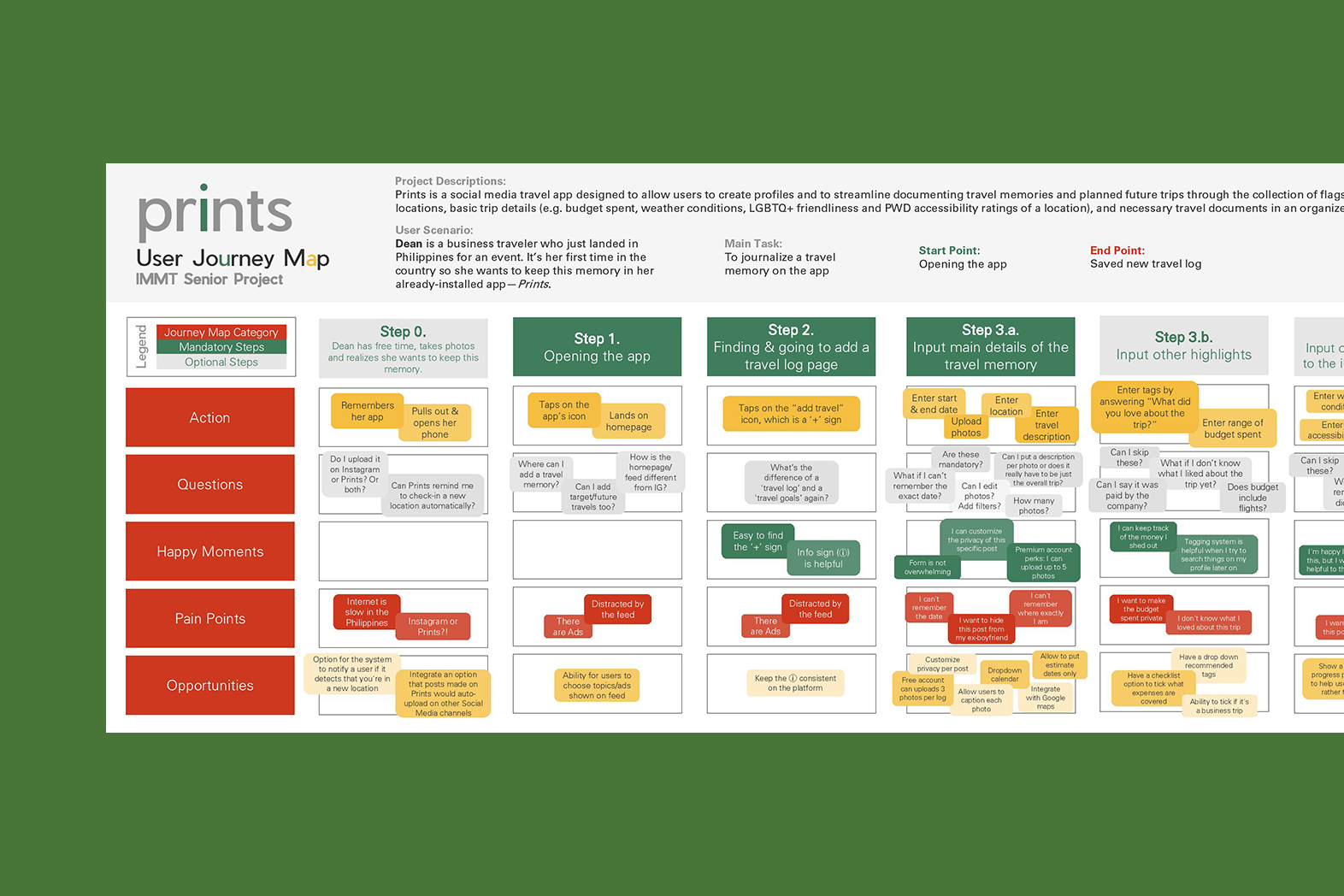 It took a total of 3 months to conceptualize and design Prints. I was assisted by one colleague, Taciana Vieira Kolisch, all throughout the process (visit her portfolio at tacikolisch.com). It was also overlooked by two dedicated mentors who specialized in (1) International Development and Marketing and (2) Travel and Photography.